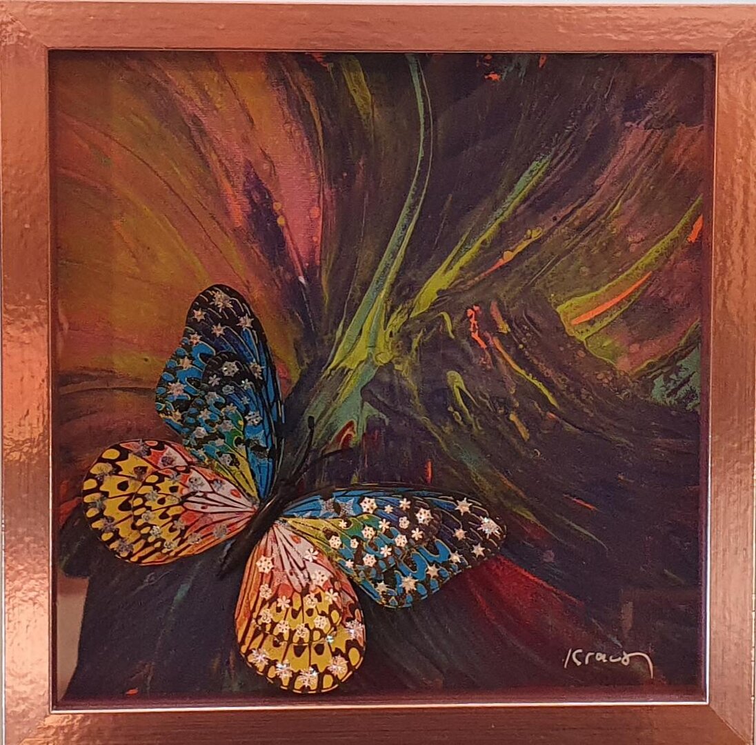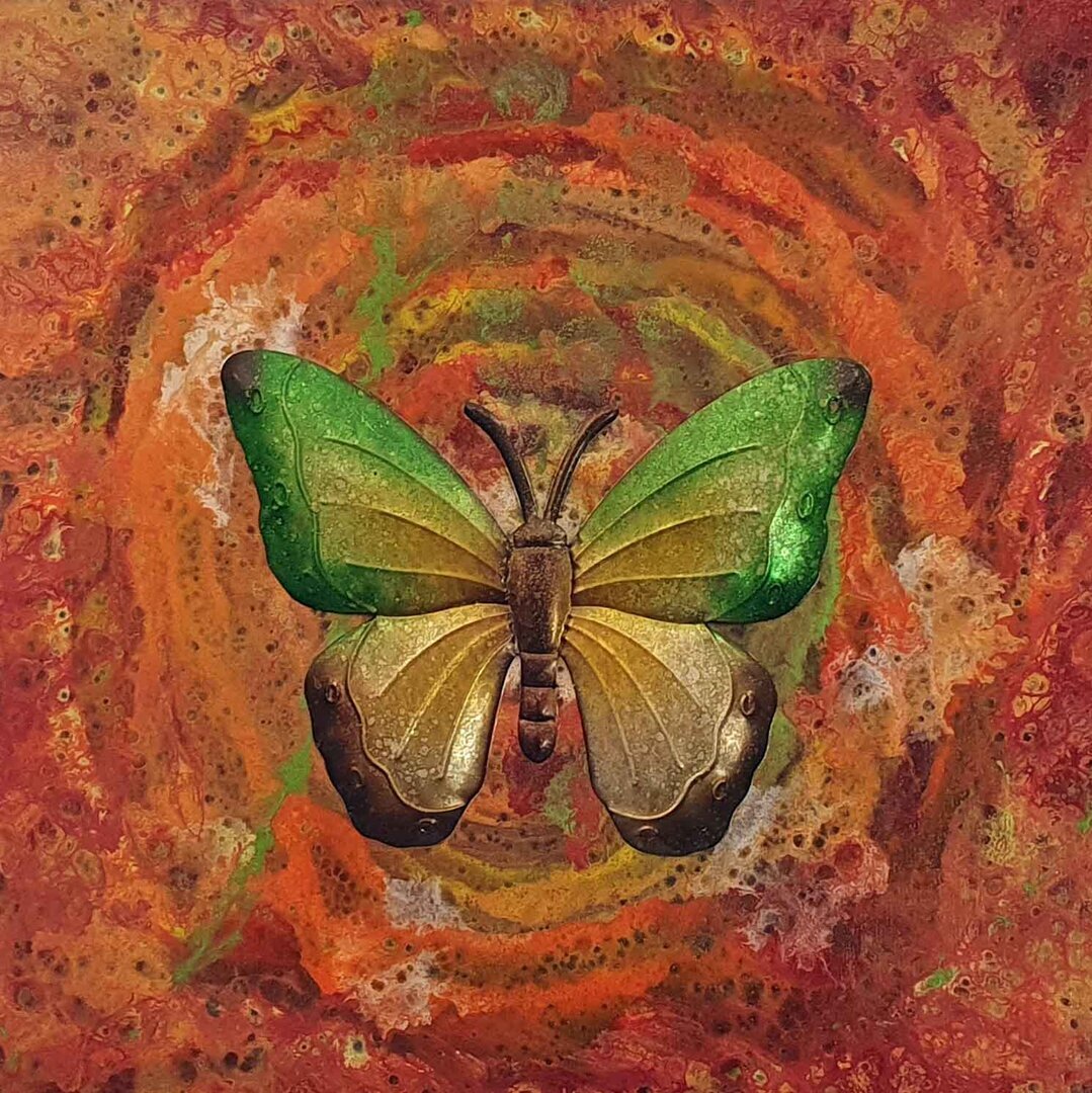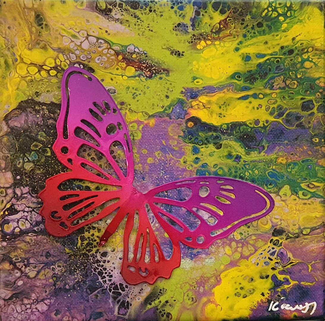 Wunderschön farb-verlaufender Metall-Schmetterling auf herrlich buntem Hintergrund in Acryl-Pouringtechnik.