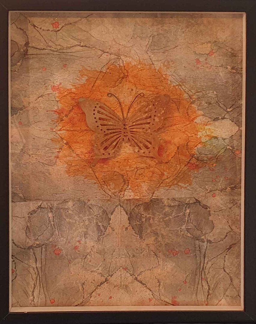 Rostfarbener Metallschmetterling auf metallisch-orangenem Fleck auf Hintergrund aus gelackten Servietten im Boxrahmen.