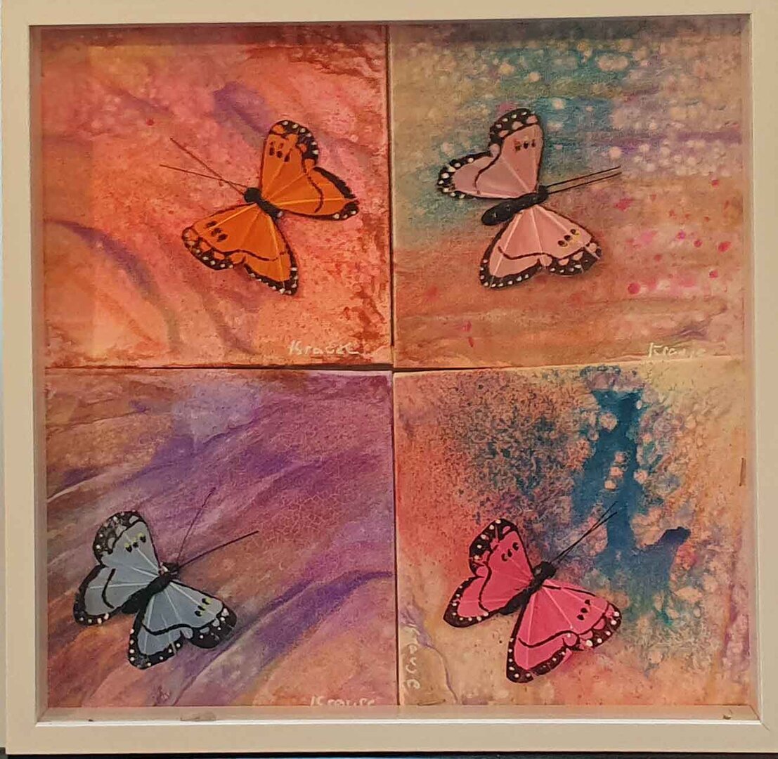 4 kleine Einzel-Malpappen (15x15cm) mit wunderschönen Pouring-Effekten von Acryl-Farben mit Feder-Schmetterlingen zusammengefasst im Boxrahmen.