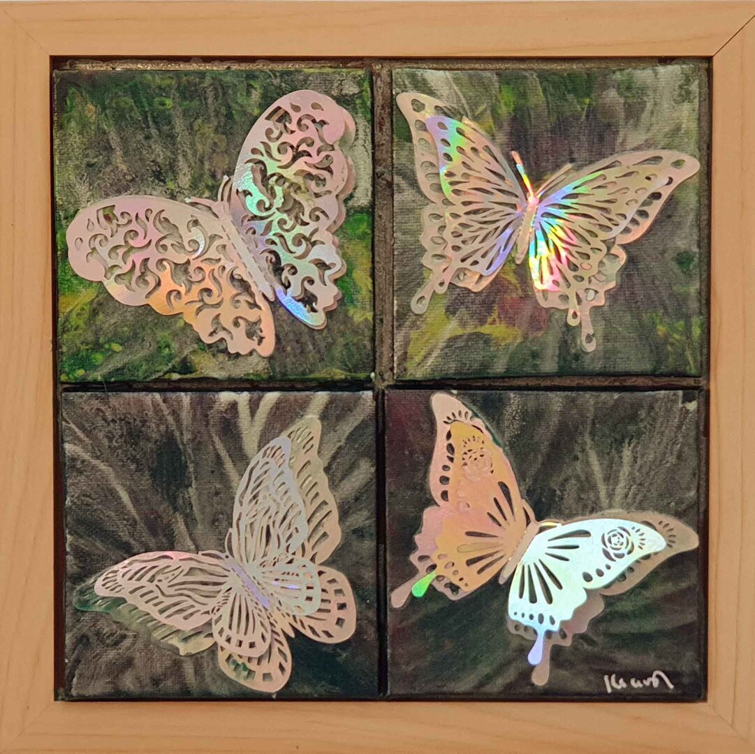 4 kleine Canvasse (10x10cm) mit unterschiedlichen, irisierenden Silber-Schmetterlingen mit Doppelflügeln auf Acrylfarben in Wischtechnik.