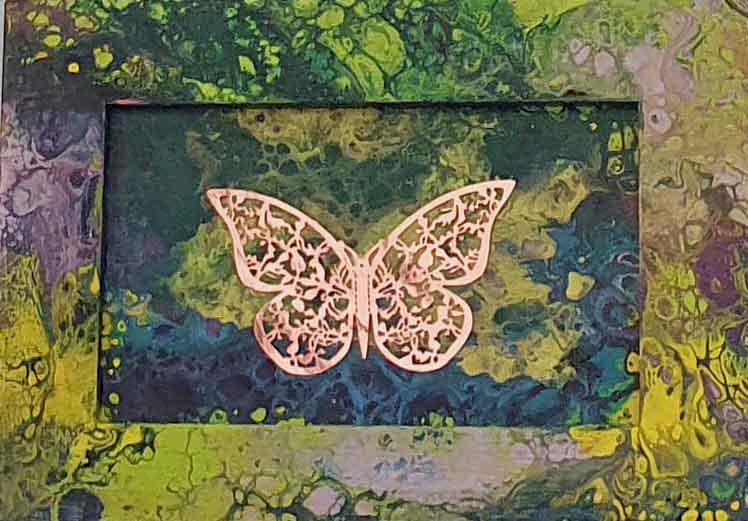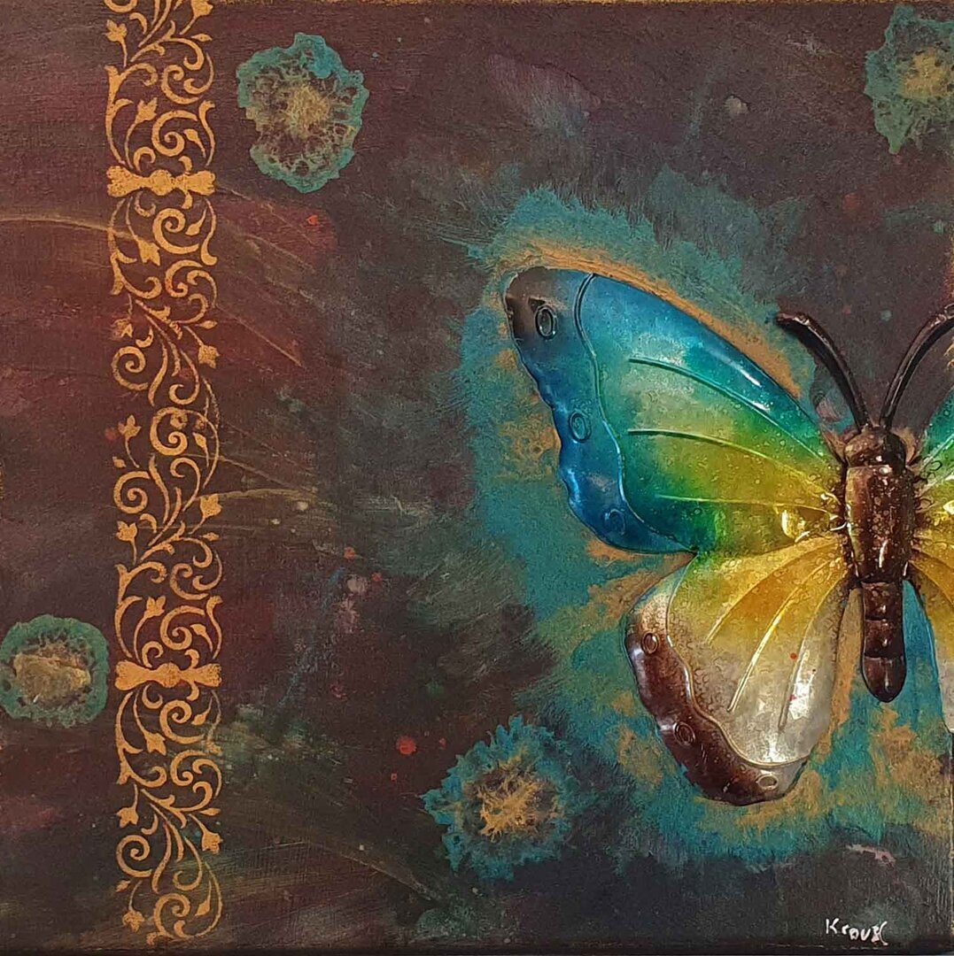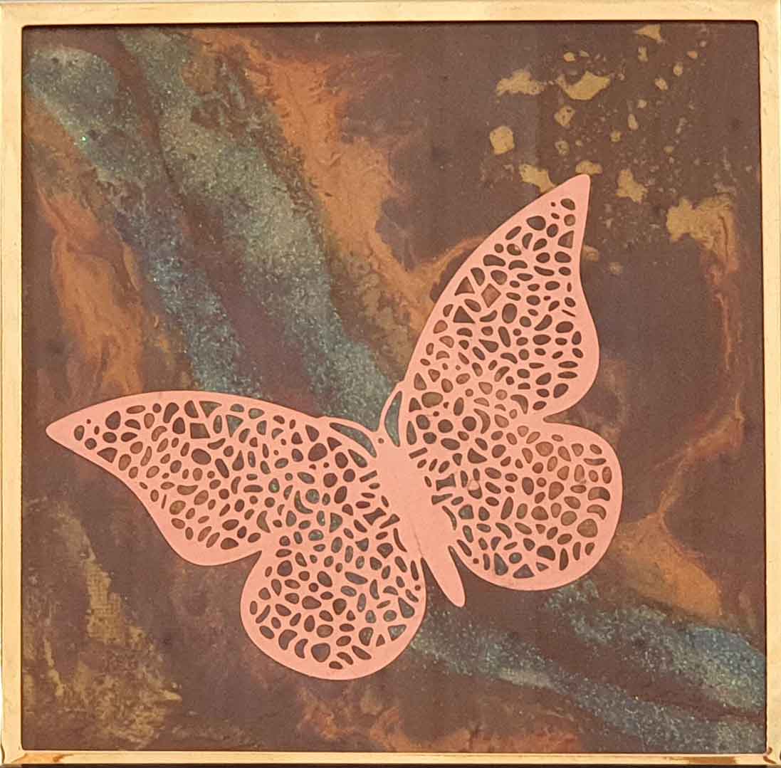 Kupferfarbener, sehr filigraner Schmetterling auf einer Malpappe. Der Hintergrund ist aus einer Mischung von Pouring- und Aquarell-Techniken entstanden und sieht wie eine Meereslandschaften oder die Milchstraße aus. Es gibt in diesem Stil insgesamt 7 Variationen. -