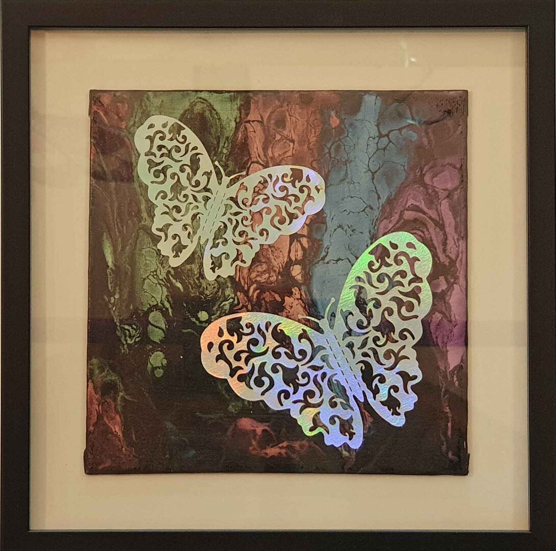 2 sehr filigrane silbern schillernde Schmetterlinge auf einem Hintergrund aus pastell-metallischen Acryl-Sonderfarben in Wischtechnik.