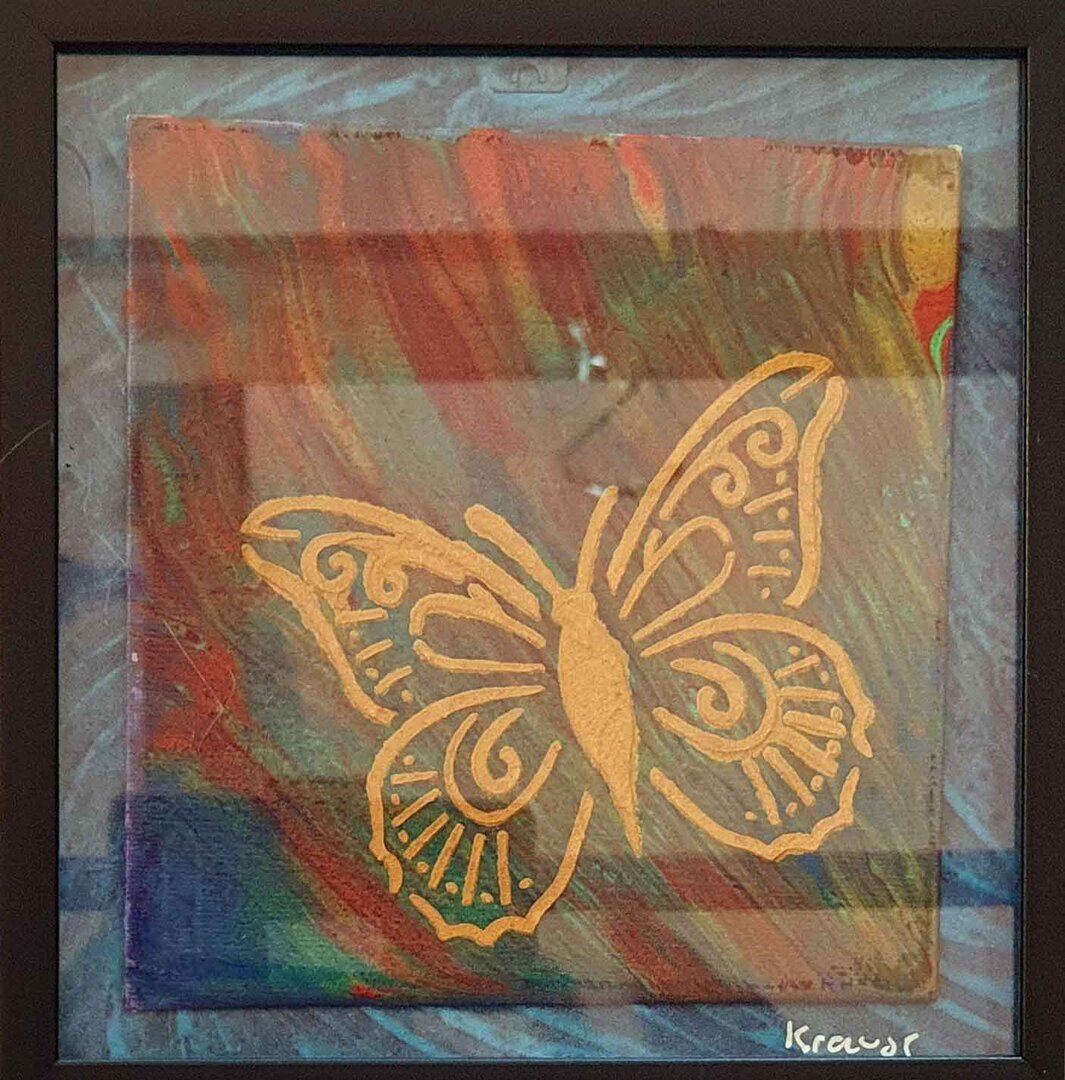 Kleine Malpappe (15x15) mit goldenem Relief-Schmetterling auf gewischten Acrylfarben. Die Malpappe befindet sich auf einem Kontrast-Hintergrund.