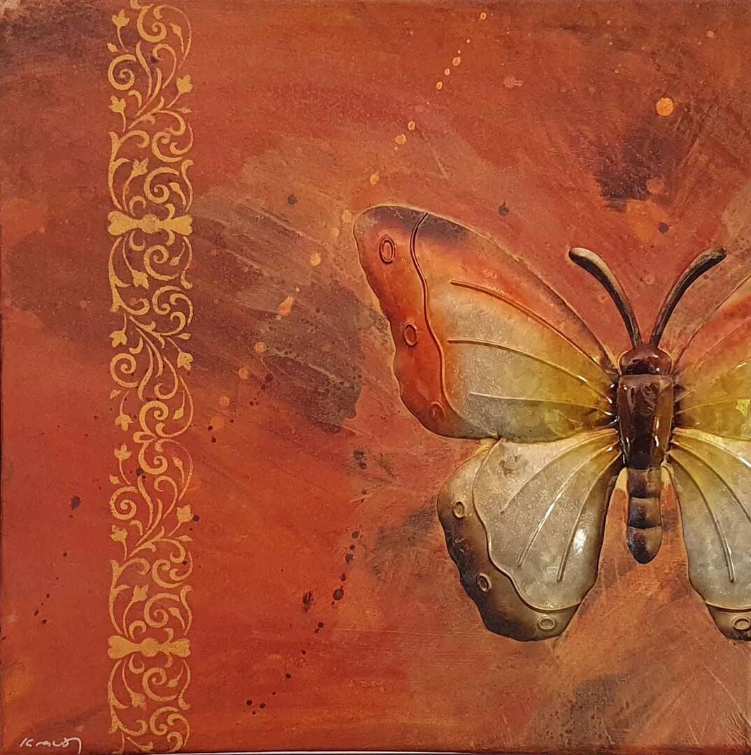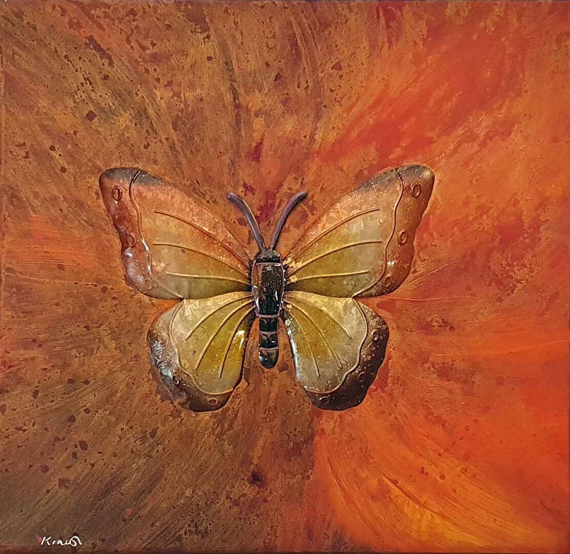 Großer Metall-Schmetterling (30 cm ∅)auf flammendem Hintergrund. Mehrere Farbschichten übereinander inkl. goldenem Finish sind durchgerieben und ergeben dadurch sehr spezielle Strukturen.
